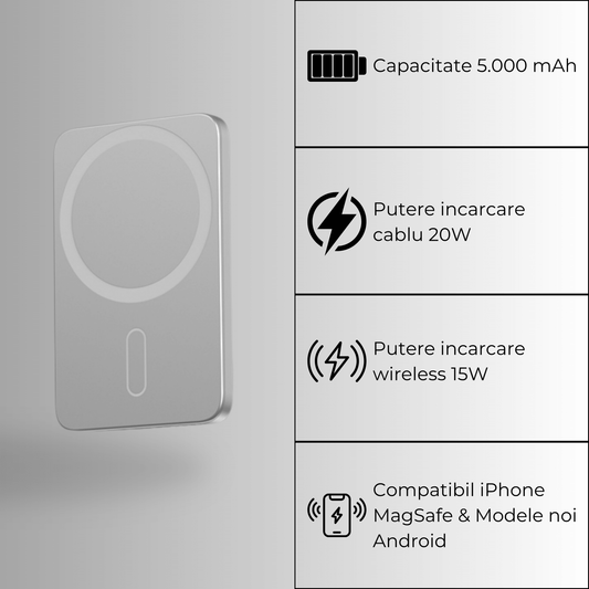 Baterie externă 5000mAh MagSafe 15W, Aluminiu, Gri deschis