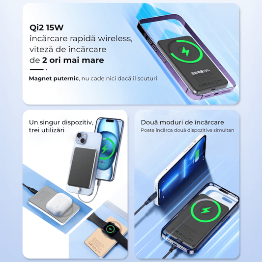 Baterie externă 5000mAh Qi2 15W Wireless & 20W Cablu, Plastic