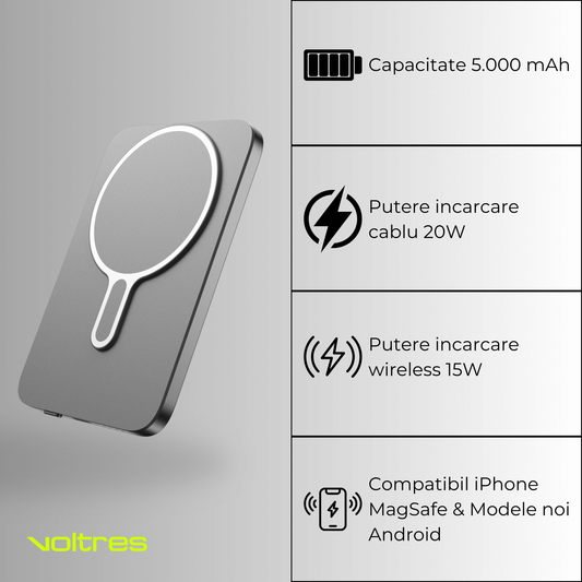Voltres este un brand românesc specializat în baterii externe de calitate — de la baterie externa MagSafe compatibilă iPhone 12–17, până la baterii externe de capacitate mare de 30.000mAh pentru laptop și călătorii. Fiecare produs este ales pentru fiabilitate, design compact și performanță reală. Indiferent că ai nevoie de un acumulator extern slim pentru zilnic sau de o baterie externă robustă pentru deplasări lungi, la Voltres găsești varianta potrivită. Livrare gratuită în România pentru comenzi peste 300 lei, garanție 24 luni și retur simplu în 14 zile.