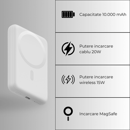 Baterie Externă MagSafe 10000mAh 15W Wireless & 20W Cablu, Alb