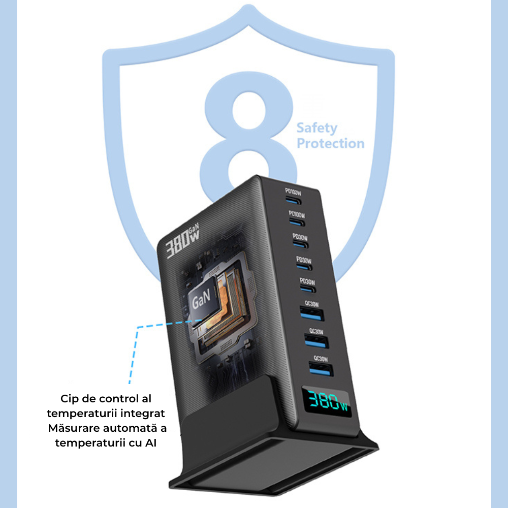 Cu 380W putere totală și 8 porturi, ai stația de încărcare premium care înlocuiește toate încărcătoarele clasice.
